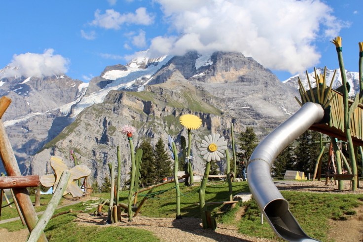 The children’s playground overlooking a beautiful snow capped mountain in Allmendhubel, MĂĽrren in Switzerland.